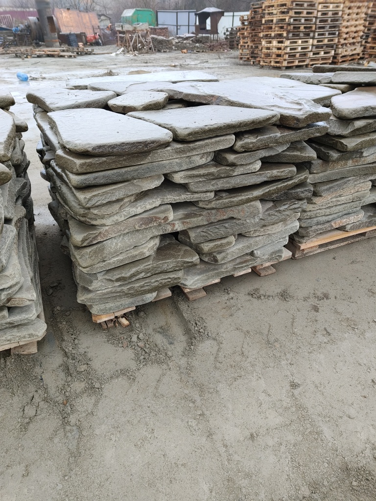Галтованный серо-зелёный песчаник для мощения дорожек, пешеходных зон, тротуаров на землю, грунт, песчано-щебёночную подушку.